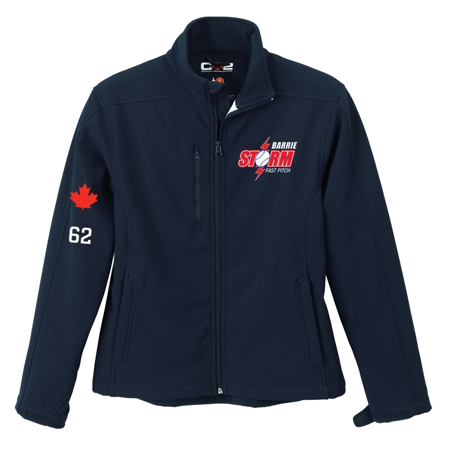Polyester / spandex 3-layer bonded fleece softshell. Active stretch, breathable, wind and water resistant properties. Adjustable tab closure on cuffs. Two zippered front pockets with zippered right chest pocket.
